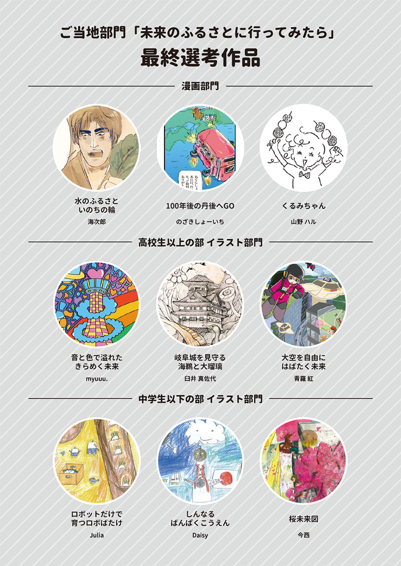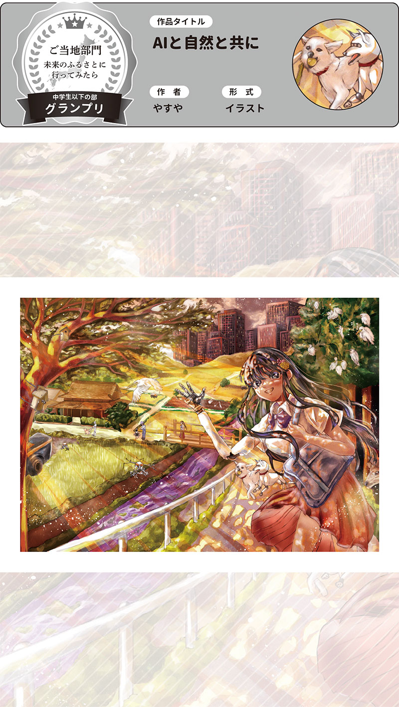 この部門では、「希望に満ちた未来の地方」をテーマに、あなたの描く“未来のふるさと”を募集します。 空飛ぶ野菜畑?AIと一緒にお祭り?森の中に浮かぶ図書館? どんなアイデアも大歓迎!